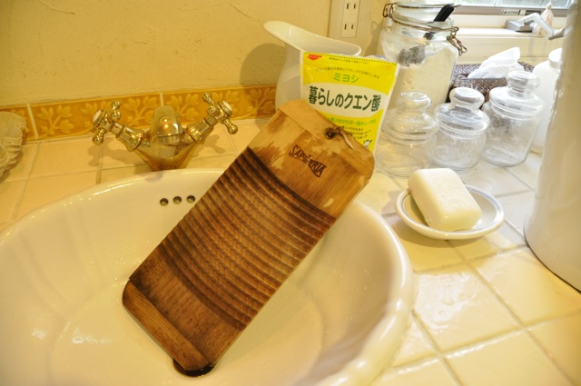 石けんと洗濯板で軽く洗って、バケツに浸けおきしてから