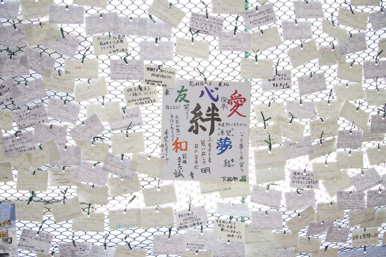 会場内の壁には被災地へのメッセージが書かれていました。